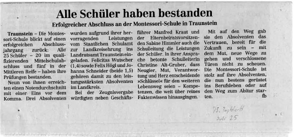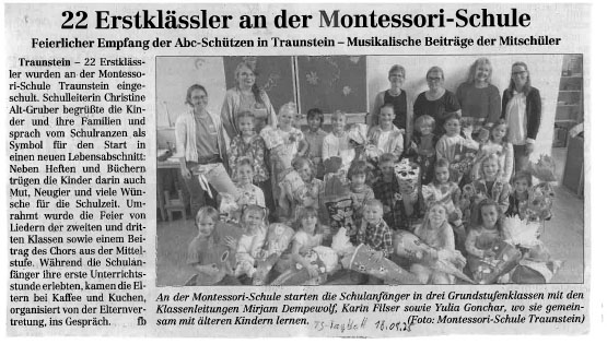 Am Mittwoch, den 11.09.2024 war es so weit: Die Montessori-Schule begrüßte 23 neue Erstklässler und ihre Familien zu einer festlichen Einschulungsfeier. Christine Alt-Gruber aus der Schulleitung hieß die Kinder mit einer kurzen Rede willkommen und verwendete dabei das Bild eines Apfelkerns, um das Potenzial, das in jedem Kind steckt, bildhaft zu beschreiben: Wie in einem winzigen Kern das Wunder eines ganzen Baumes schlummert, so liegt auch in jedem Kind die Kraft, zu wachsen und sich zu entfalten. Die Schule und die Lehrer spielen dabei eine wichtige Rolle, ebenso das häusliche Umfeld: Mit dem Satz von Maria Montessori „Hilf mir, es selbst zu tun!“ stehen wir alle vor der Aufgabe, junge Menschen anzuleiten, zu helfen aber auch loszulassen.